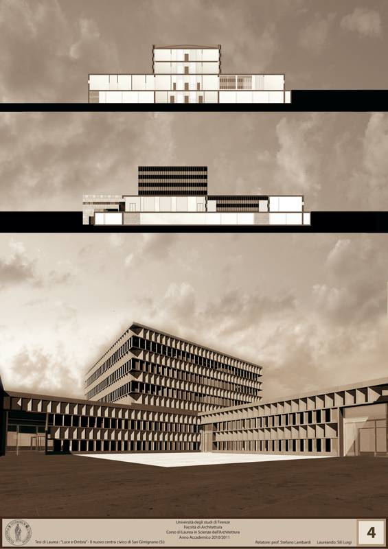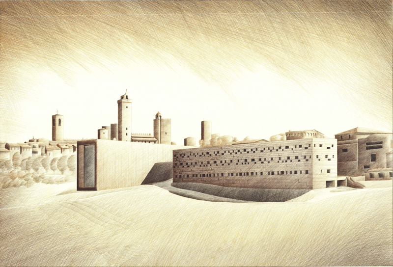 Molti dei temi che sono stati sviluppati nelle varie proposte progettuali nascono da un’analisi del carattere di San Gimignano e della sua architettura: l’edificio a corte è stato fonte d’ispirazione sia per il tema affrontato del Palazzo Comunale, sia come logica conclusione dell’appendice sud della città rispetto alle altre, entrambe concluse con grandi complessi a corte; il tessuto urbano declinato sia come un pieno scavato, sia per quanto riguarda il rapporto con il fronte strada rispetto al degradare del terreno; la ricerca di visuali indirizzate attraverso specifiche direzioni o cannocchiali sul paesaggio; il limite tra città e campagna che si palesa nelle mura e viene nuovamente interpretato come bastione, muro o recinto; infine il rapporto tra piazza-basamento-monumento, tema vitale nella forma di San Gimignano a partire da piazza Duomo.